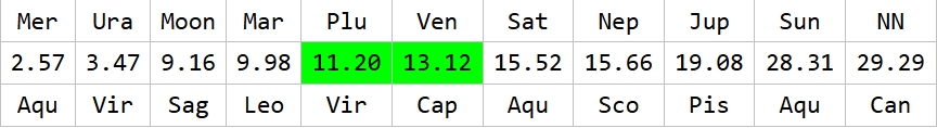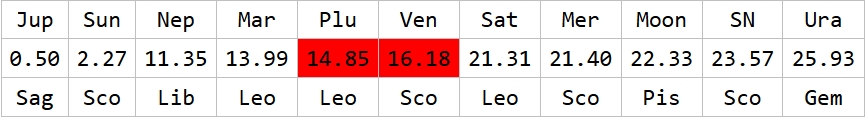 Transiting planet Venus moves relatively fast and therefore will aspect his natal Pluto frequently during this person’s life time. Even more significant is that Venus will be in the same SIGN as natal or transiting Pluto for longer periods of time granting this testimony.